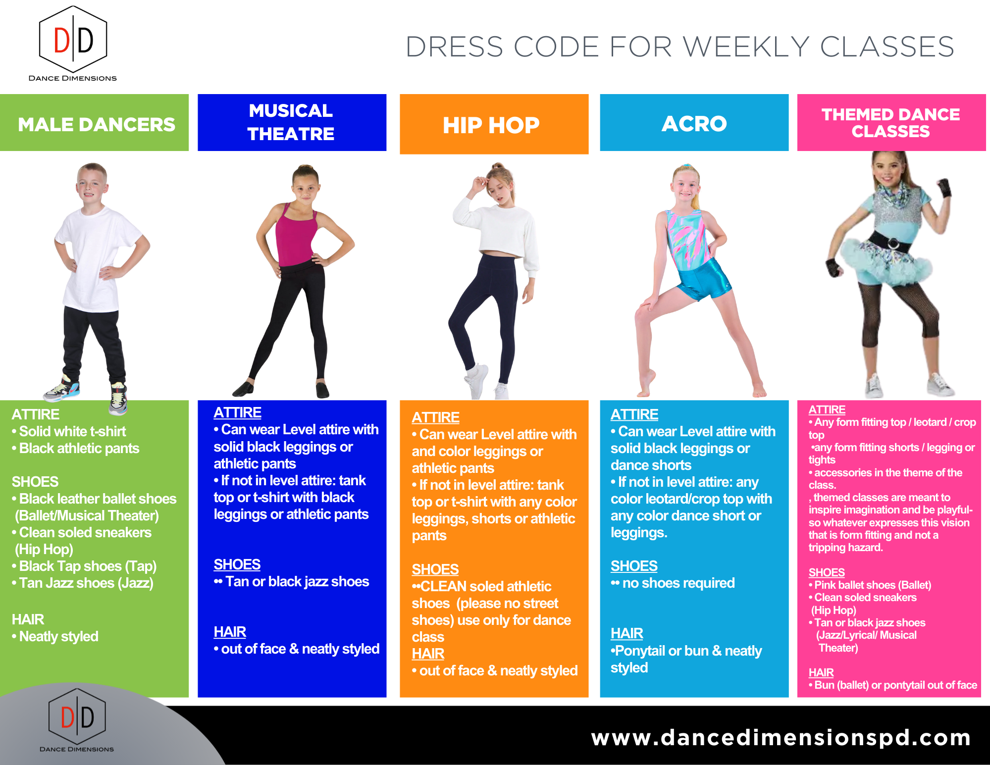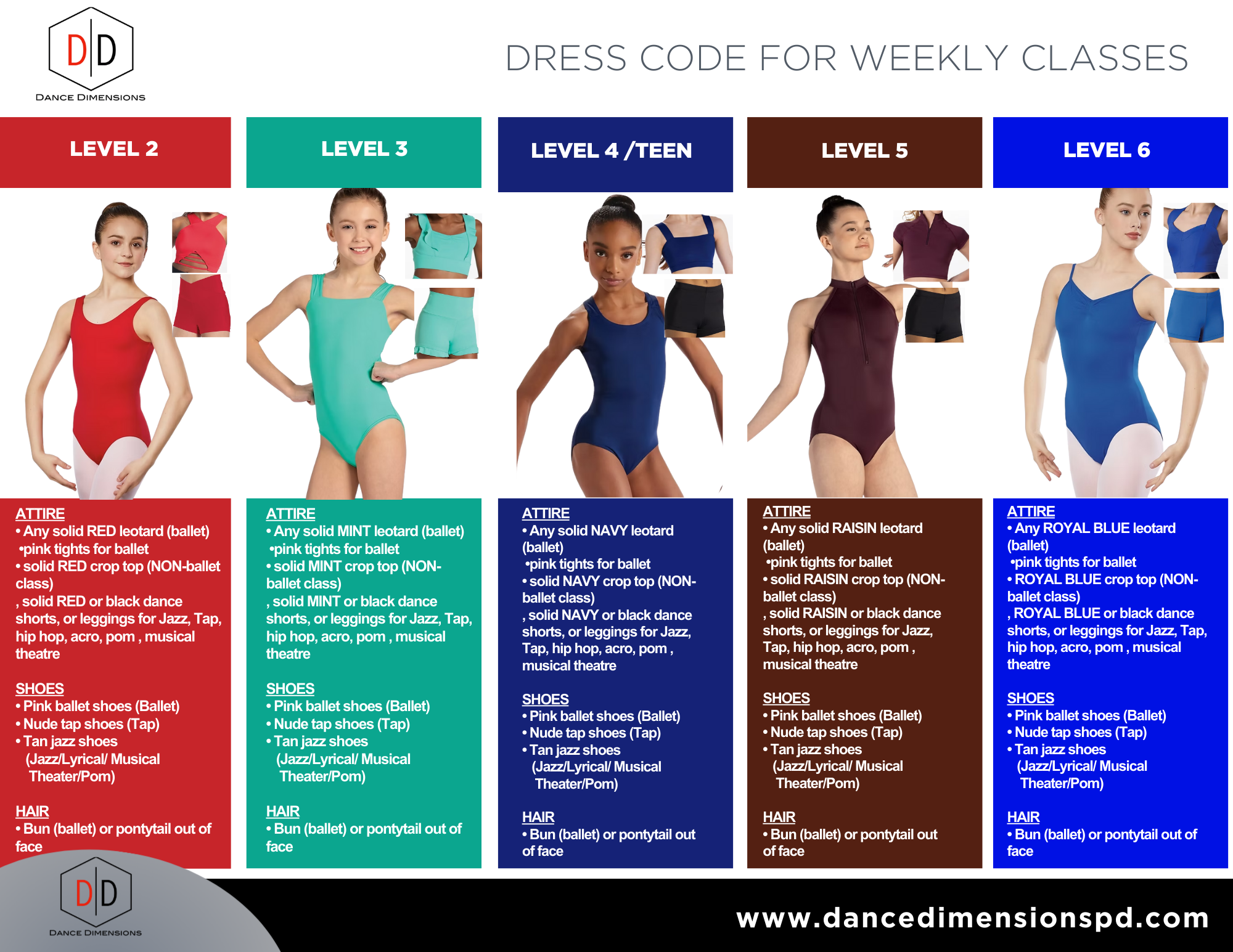 At Dance Dimensions, we believe that proper dance attire is more than just a uniform-it is an essential part of your dancer’s education, safety, and success in the studio. Every piece of required clothing and footwear is put in place for specific, intentional reasons that benefit the dancer in every class.